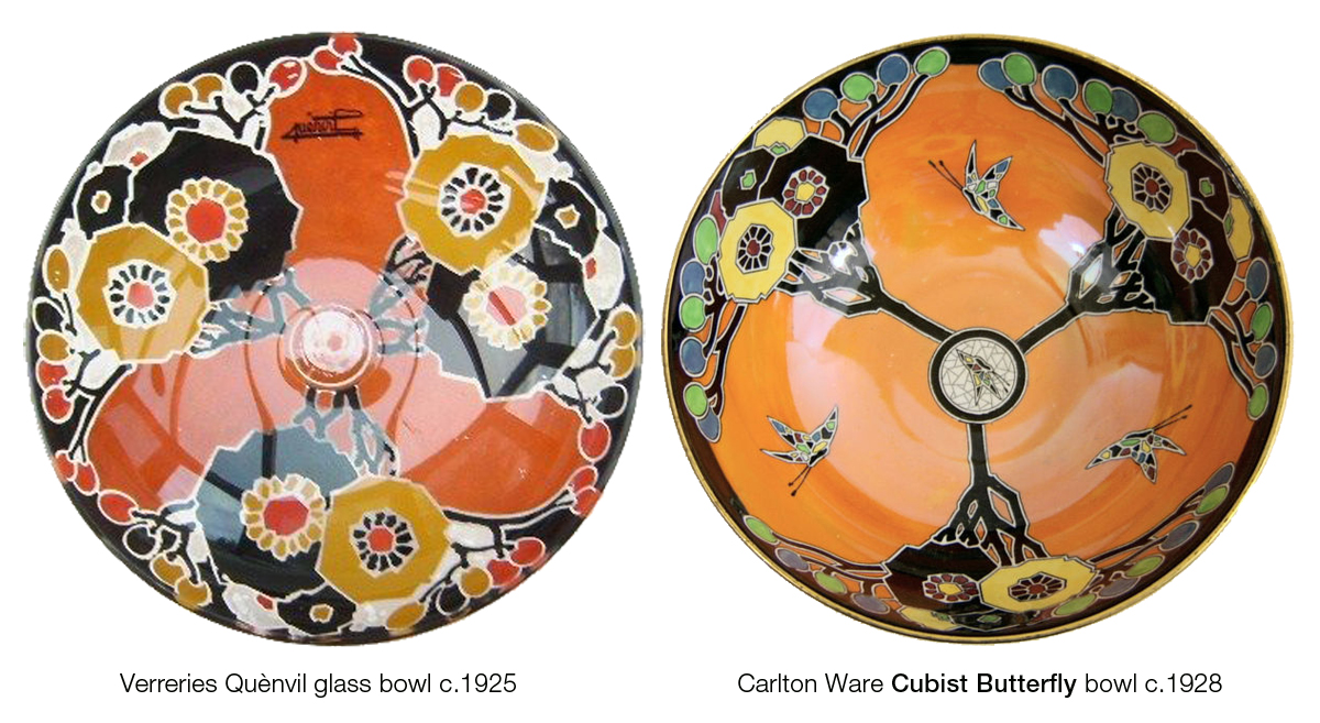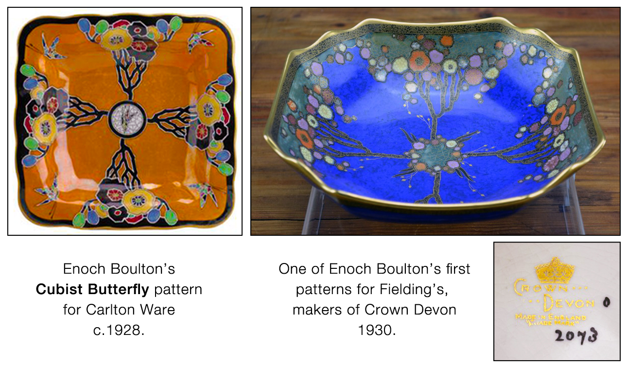 One of his Boulton's first patterns for his new employer, was a reworking of his Cubist Butterfly pattern for Carlton Ware, as demonstrated below. Click or tap on the comparison to enlarge.