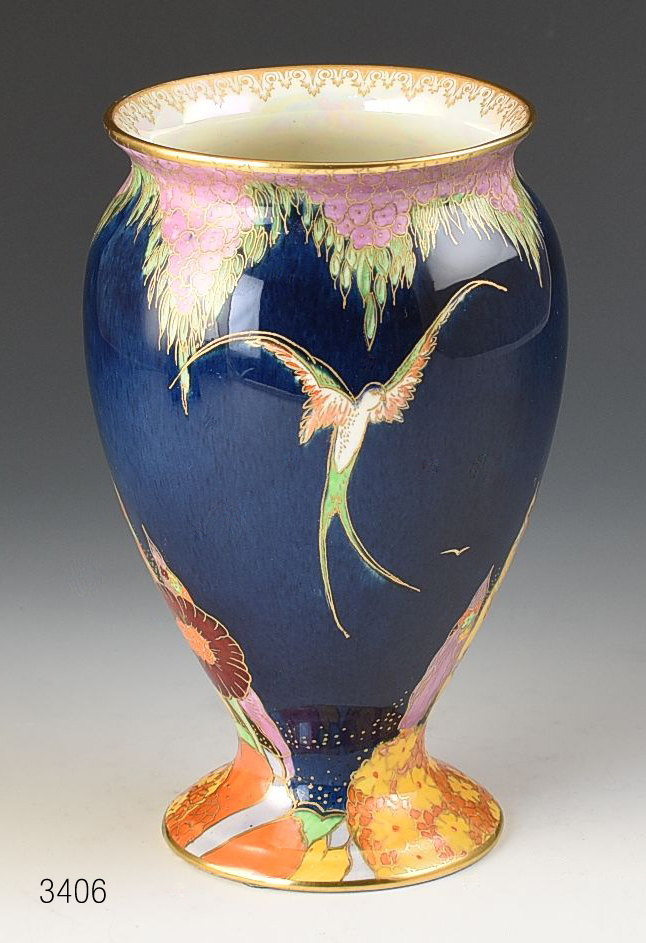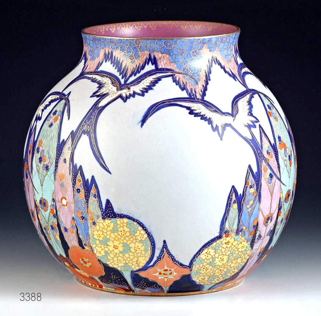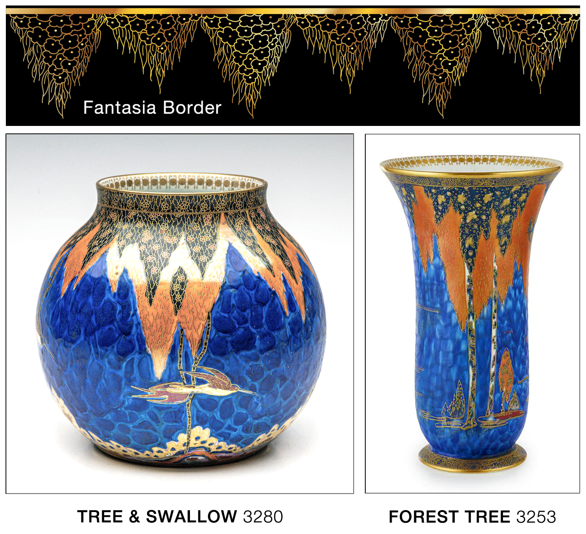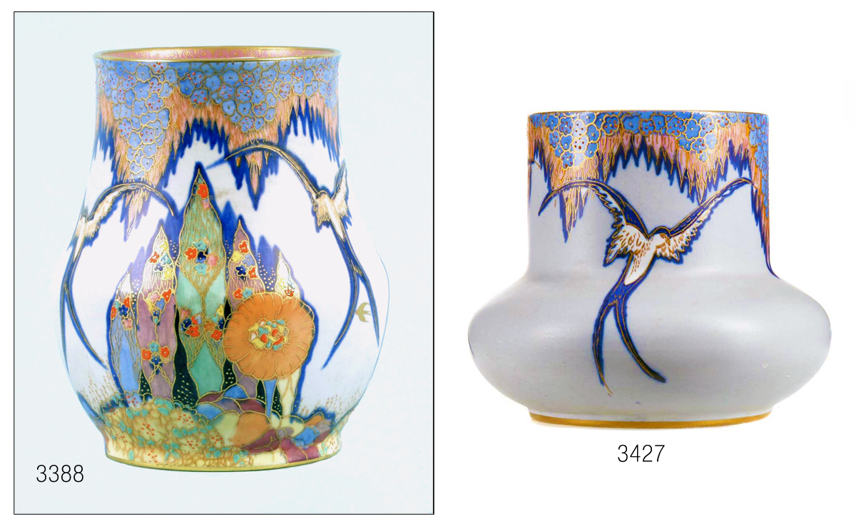 One variant, pattern number 3442, has a stippled ORANGE LUSTRE ground over a MATT glaze. Pattern 3740 has a DARK MATT BLUE ground, reserved for a lamp-base decoration. Finally, 3797 employs a SOLID RUBY ground. This last variant must have been offered three or four years after the pattern was first introduced in 1930, testimony to its popularity and of the RUBY ground.