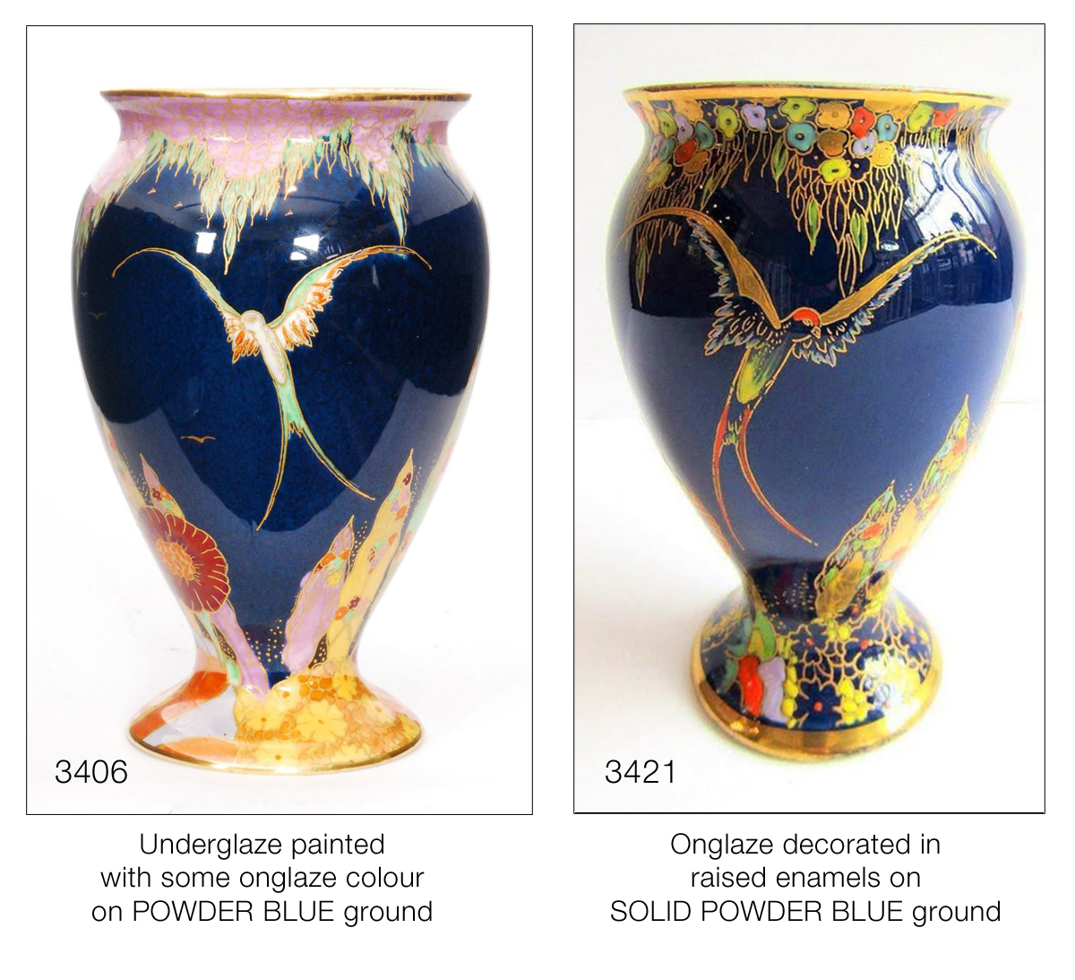 Another pattern, number 3421, also uses the same POWDER BLUE ground as on the vase above, but this time it is SOLID POWDER BLUE. Solid means that the ground colour is applied to the whole of the shape. The pattern is subsequently printed in gold directly on top of the glazed solid ground and raised enamelled — masking of the print area is not required. The raised enamels are significantly opaque and thickly applied so as to obscure the dark ground, giving a jewel-like appearance. On Fantasia 3421, parts of the pattern — in this case the bird’s wings — are hand-painted in gold, as are some elements of the trees. I show a comparison of the underglaze-painted 3406 and the SOLID POWDER BLUE version 3421 below.