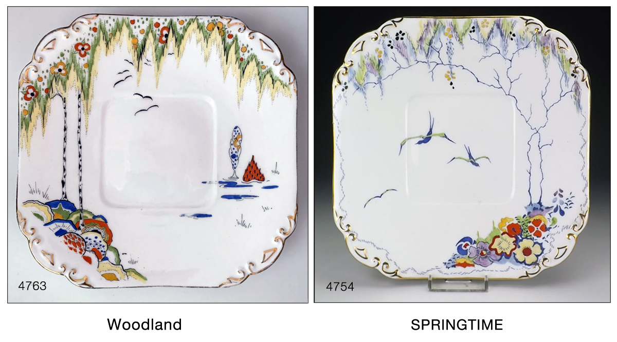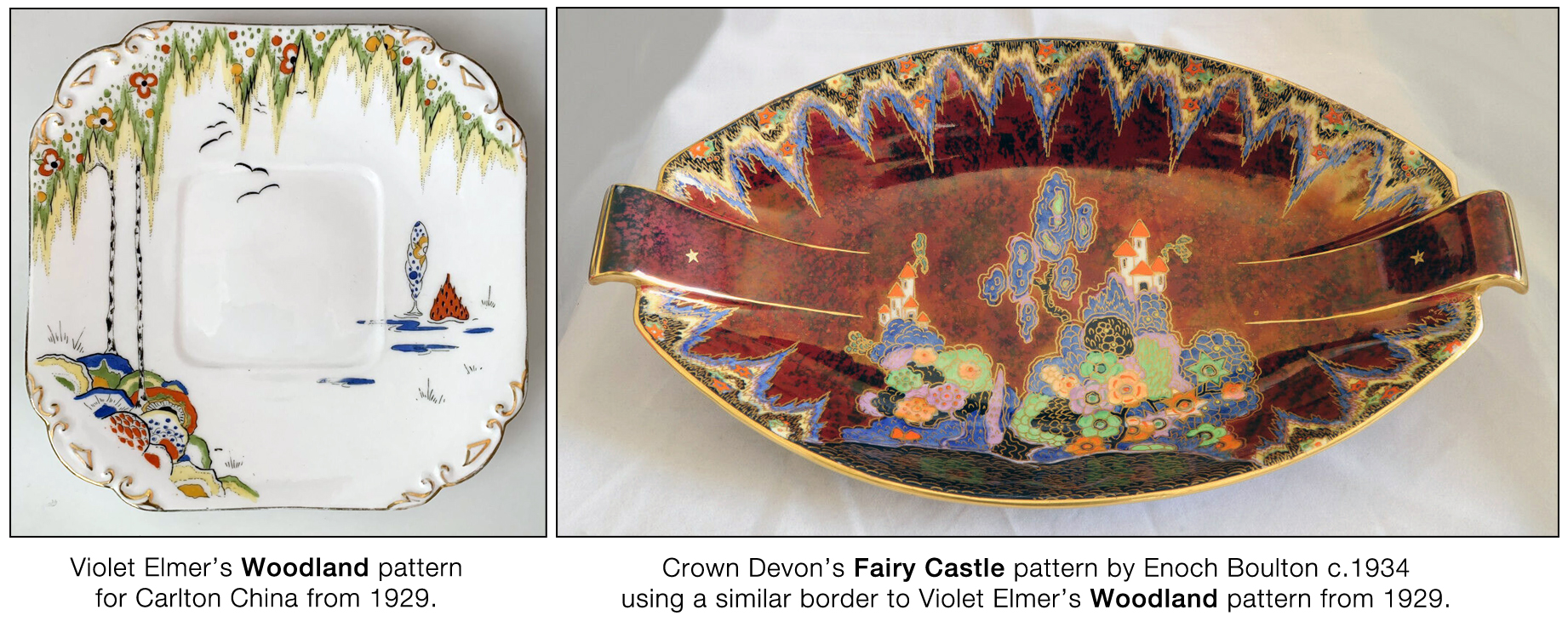 Boulton's so-called Fairy Castle pattern for Fielding's, also introduced around 1934, uses a border strikingly similar to part of Miss Elmer's Carlton China Woodland pattern of 1929. A comparison is shown below. Click or tap on the image to enlarge it and see more detail.