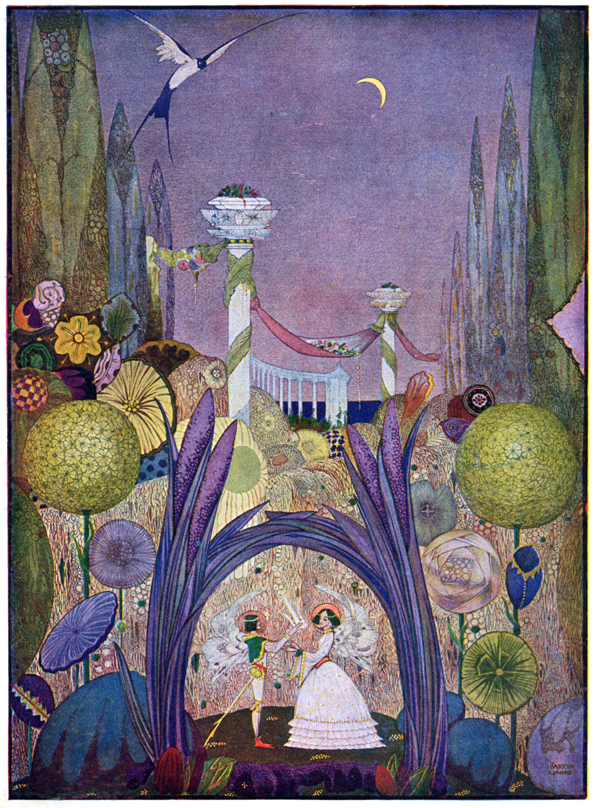 Clearly, the pattern is an adaptation of elements from an illustration by Harry Clarke in the 1916 George Harrap edition of Andersen’s Fairy Tales shown below. Clarke’s cigar‑like tall trees, lollipop trees, and bird are all echoed in the pattern, though Miss Elmer elaborates on each to suit the raised enamelling and gold printing for which Carlton Ware was known — and in which it excelled.